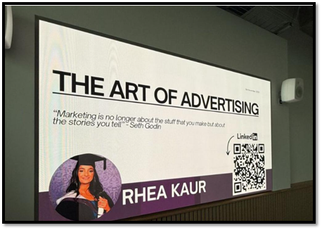 ‘Rhea was absolutely amazing! I found her presentation interesting and inspiring, especially as someone who wants to work in a similar field. The way she presented herself and talked about her achievements was so motivating. What stood out to me the most was how she used AI in her advertising projects and managed to come up with so many creative ideas while running multiple campaigns on her own. I think her session was really helpful for us as students because it gave us a real insight into what working in the industry is like and what to expect in the future.’- Ziley Tabish